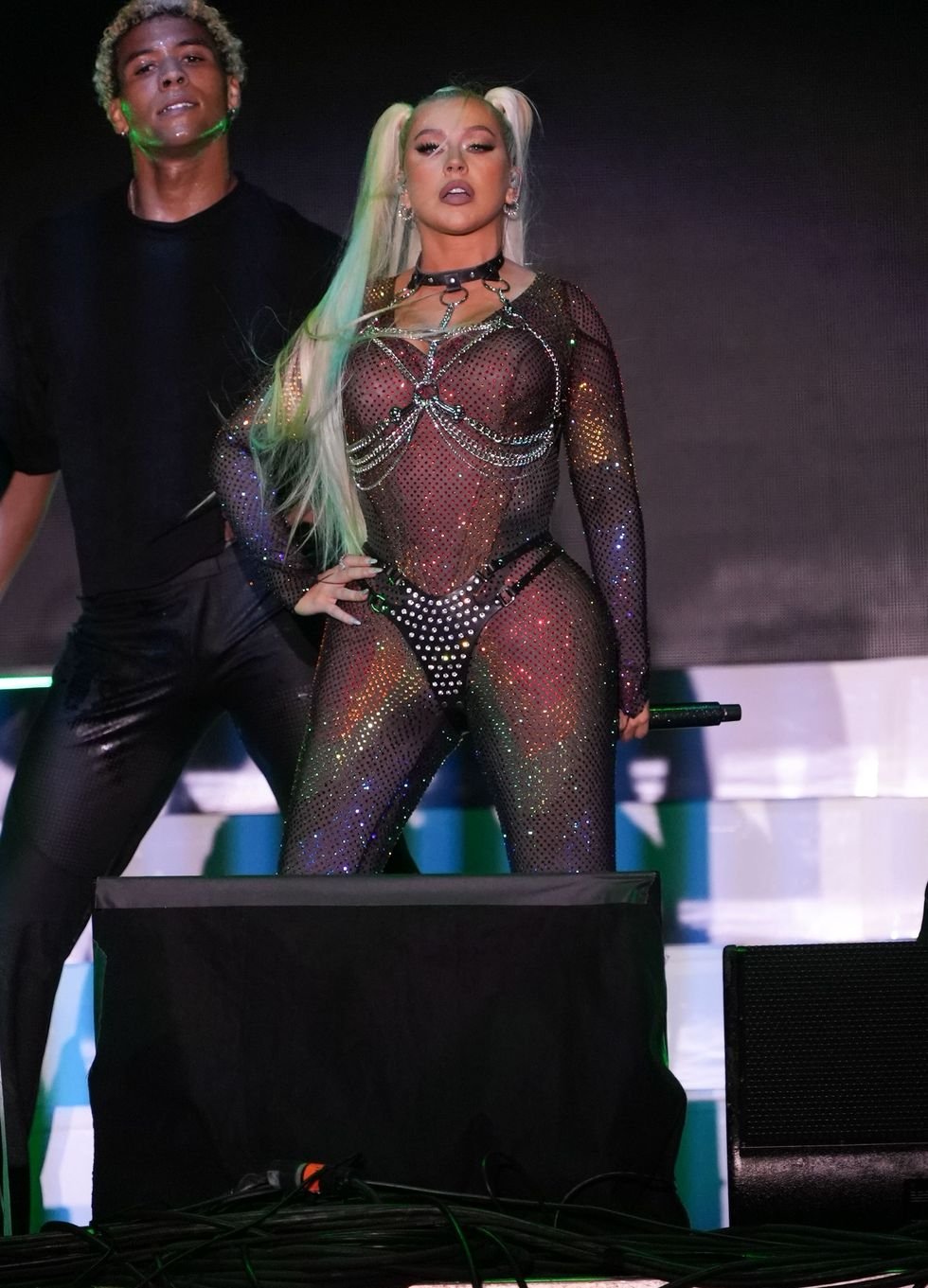 Christine broke into a remix of Your Body, before kickstarting her setlist including Genie in a Bottle, Come On Over (All I Want Is You), Dirrty, and Beautiful. She was then joined on stage by Adam Lambert, who filled in for Mya and Lil’ Kim on Lady Marmalade.