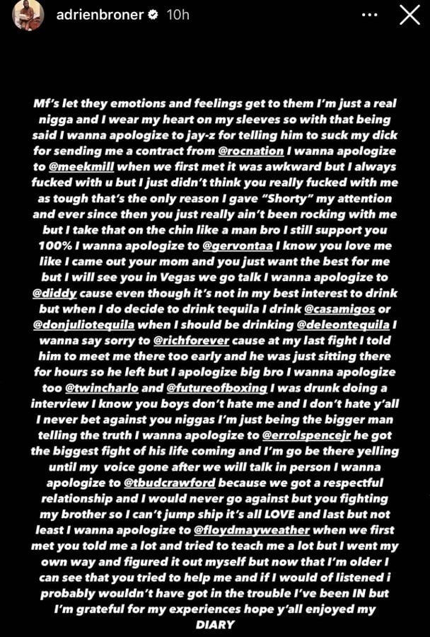 A repentant Broner started off by apologizing to both JAY-Z and Meek Mill. “I wanna apologize to Jay-z for telling him to suck my dick for sending me a contract from @rocation,” he wrote, referencing the 2015 incident which he previously apologized for.