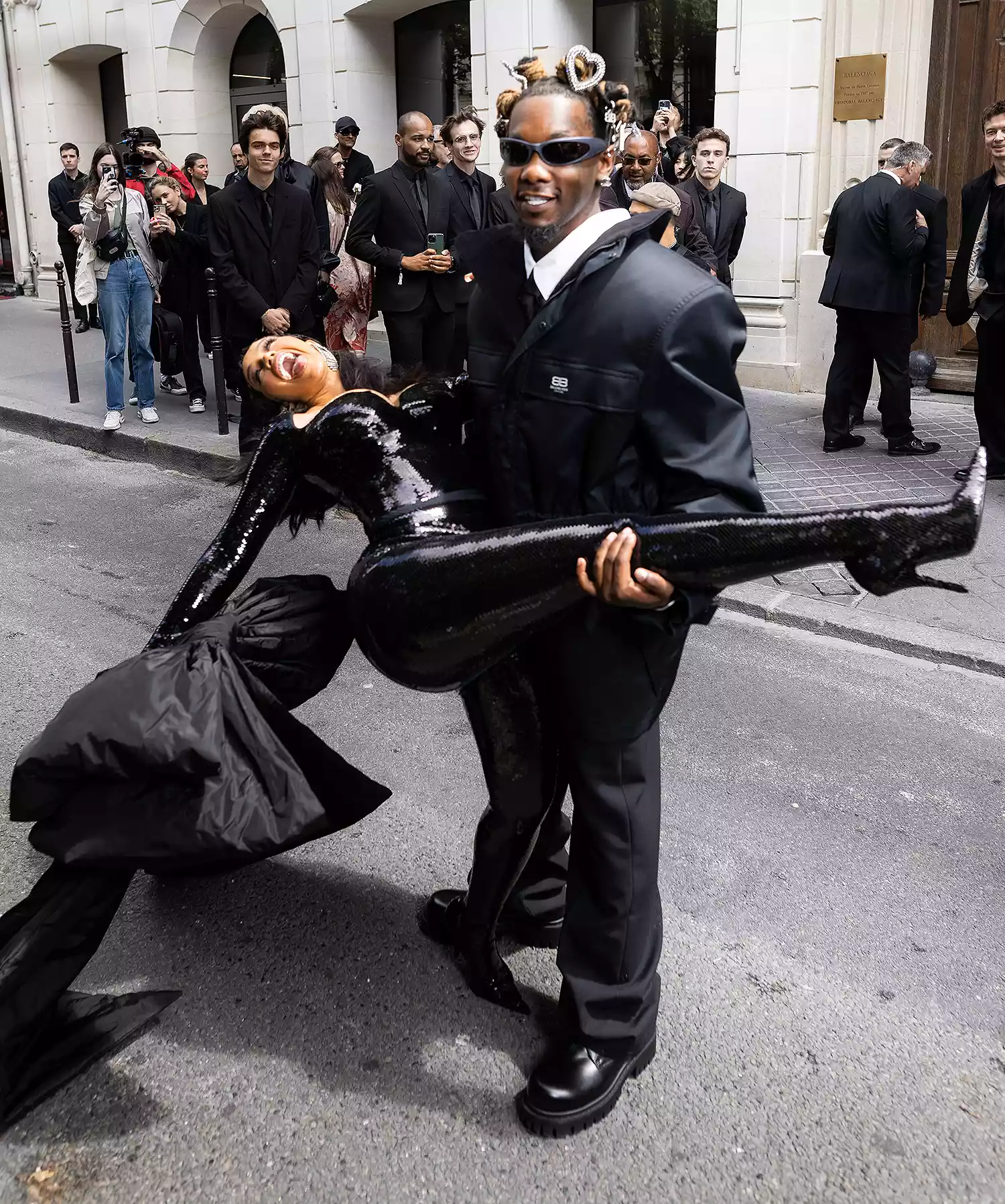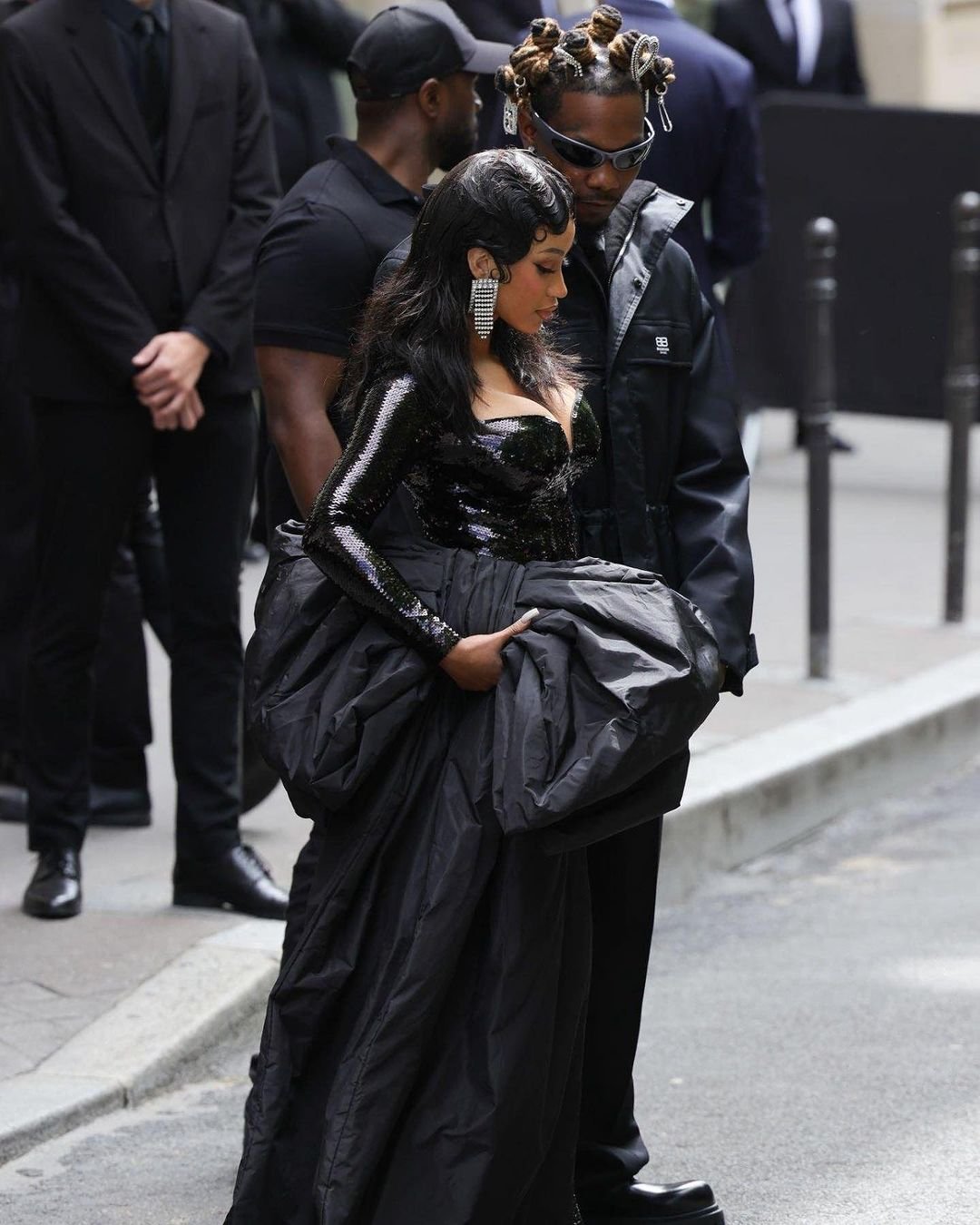 For the Balenciaga show, Cardi made an entrance in a white, swan-like tulle garment before stripping it away to reveal a sculpted, long-sleeve black sequined catsuit with an oversized bow. Offset, on the other hand, kept it classic in black pants and a black coat over a white-collared shirt and tie.